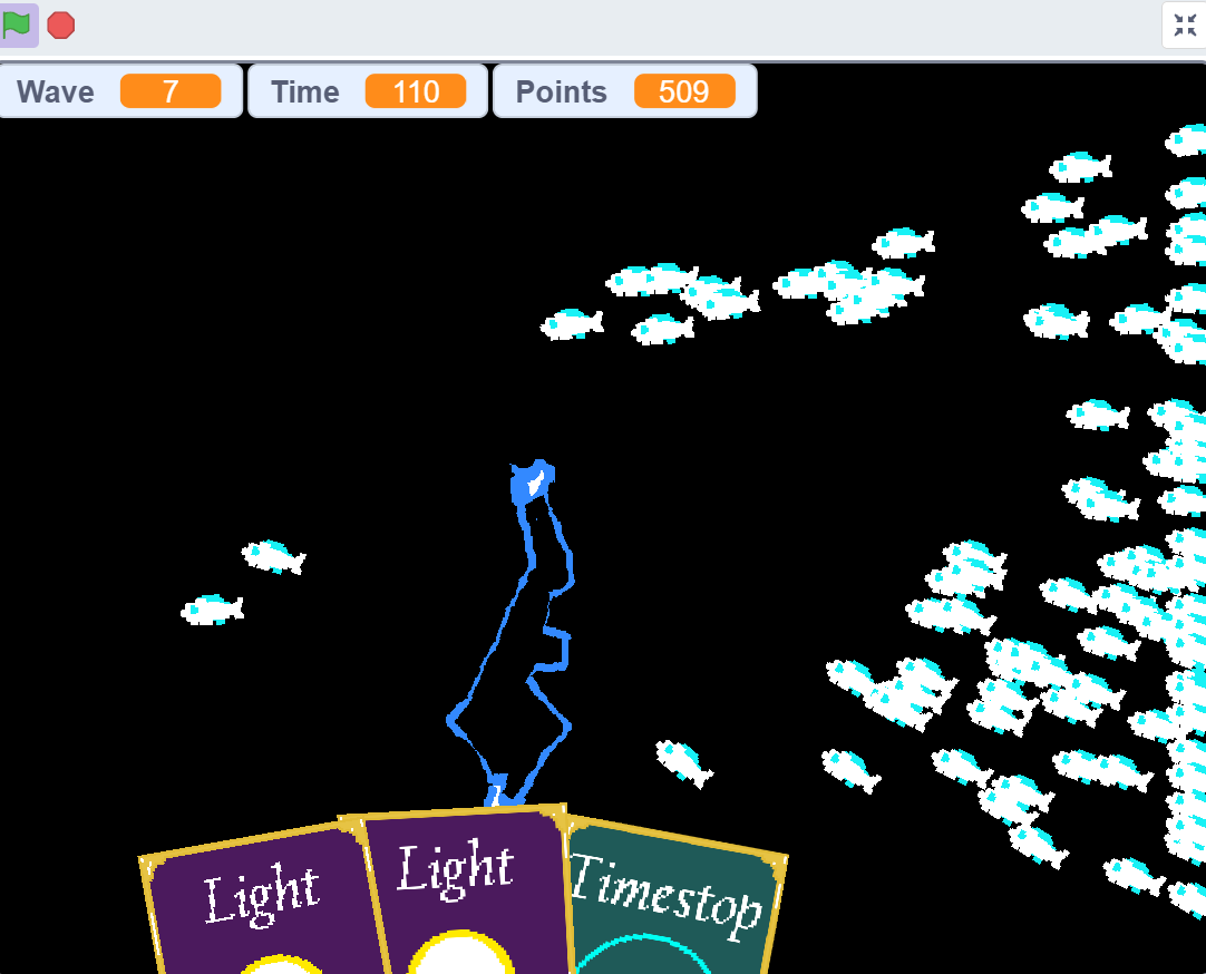 The game prompt from the competition was to focus on issues that happen often in Hawai’i. So my team and I decided to develop a game about invasive species attacking the coral reef on Maui. We decided to use tilapia as our invasive species that is attacking the coral reef. The game itself is a horde shooter-like game that takes in cards to stop the tilapia from crossing over to the other side of the screen to reach the coral reef. The first and second iterations were developed in Scratch, but the first iteration used Scratch’s pre-made images as placeholders for the cards, effects, sounds, and the fish. The second iteration used original artwork for the cards, effects, sounds, and fish. The first iteration of the game was submitted to the competition at the time, while the second iteration of the game expanded on top of the first game with additional power-ups to the cards’ effect, and added a new time stop card. However, the second iteration of the game was used as a way to create a game as a hobby rather than making it for competition.